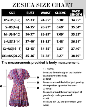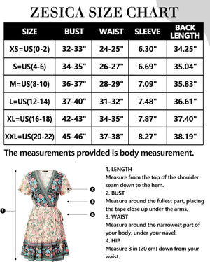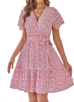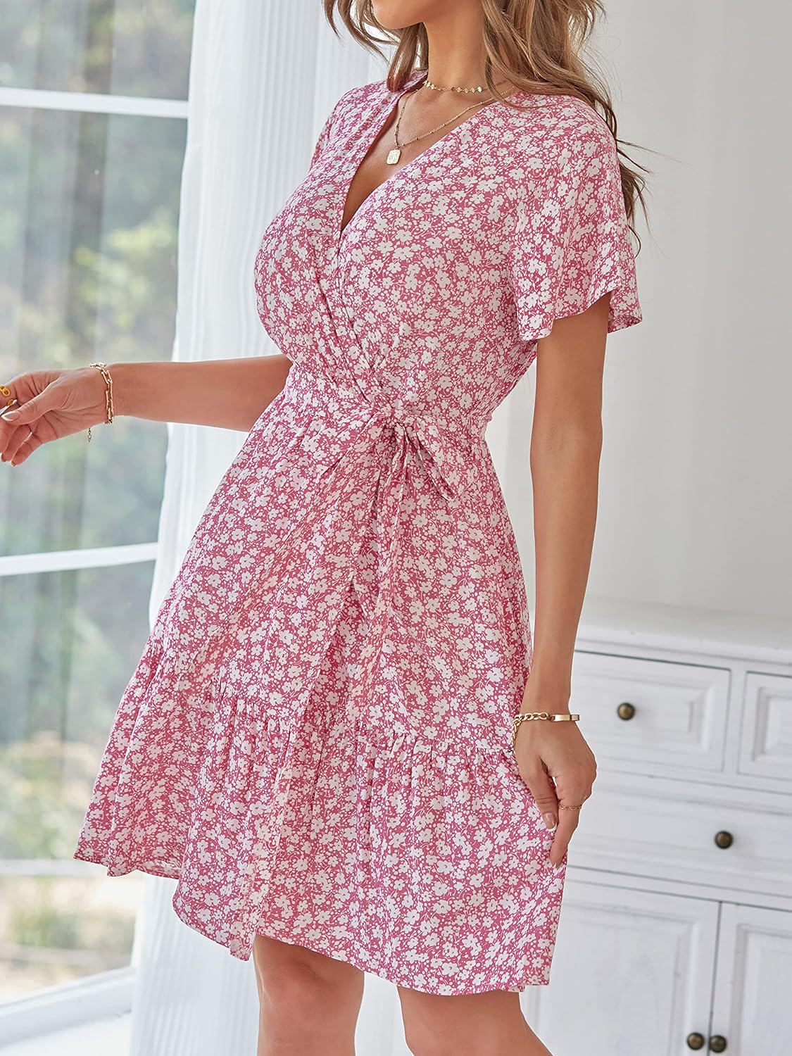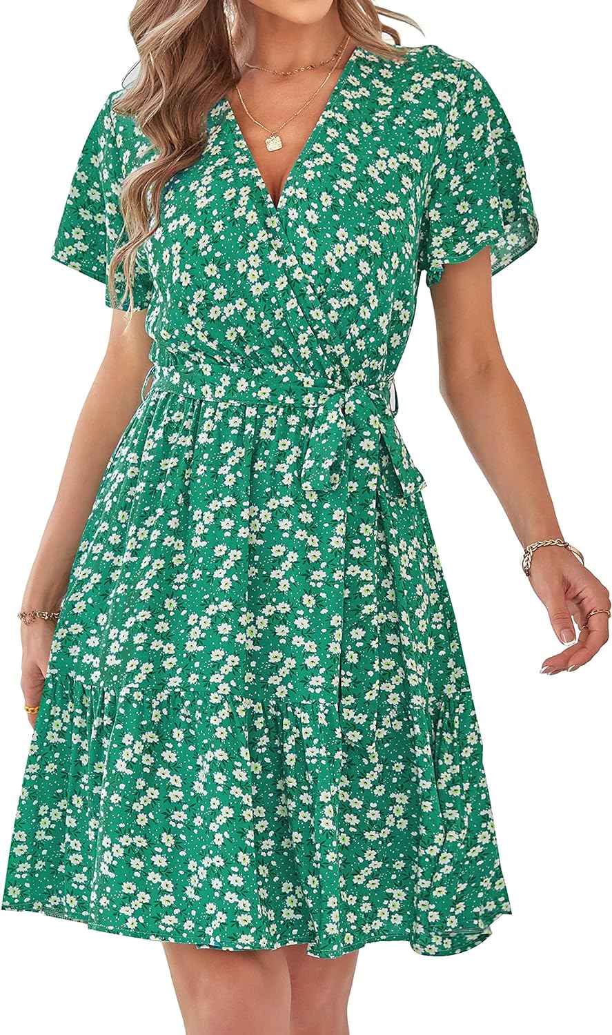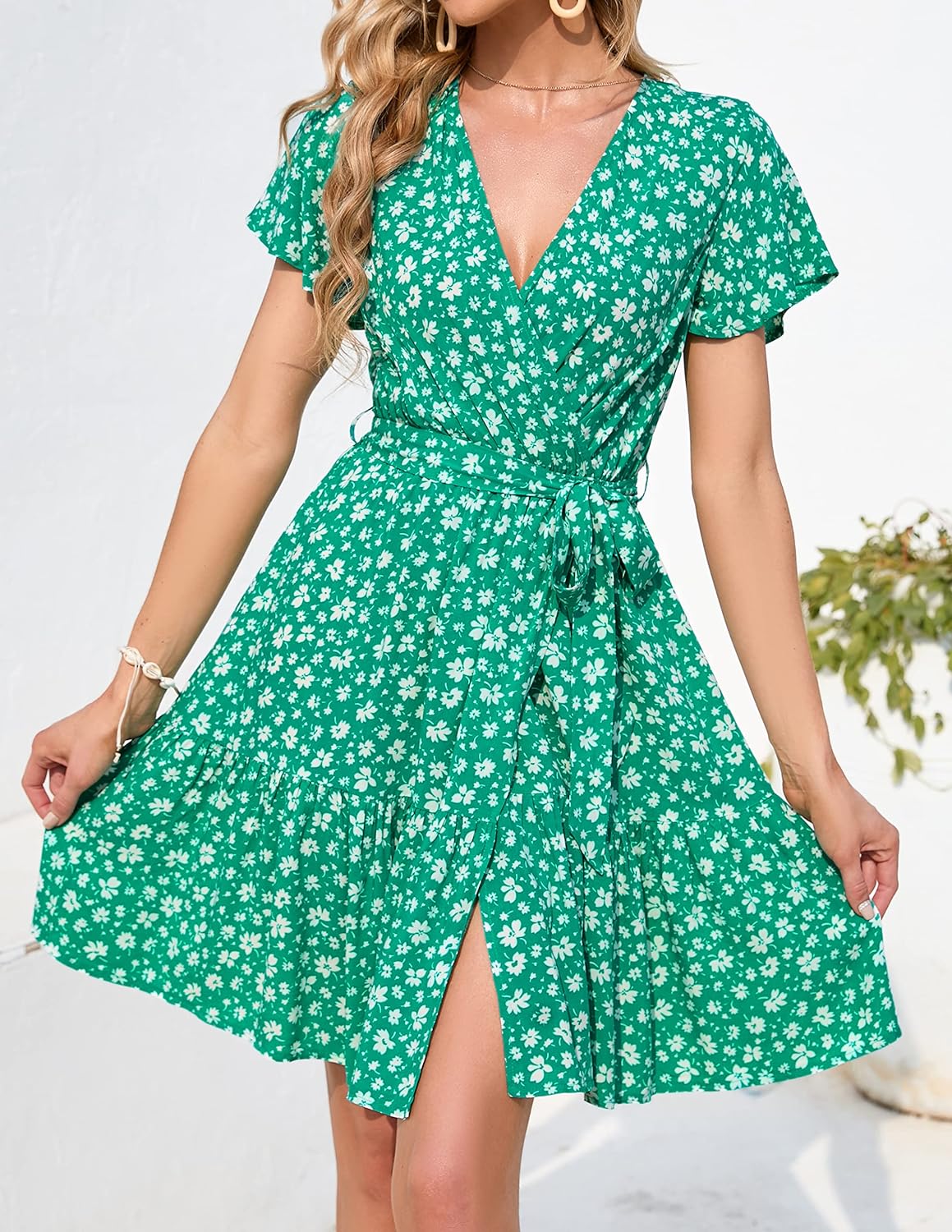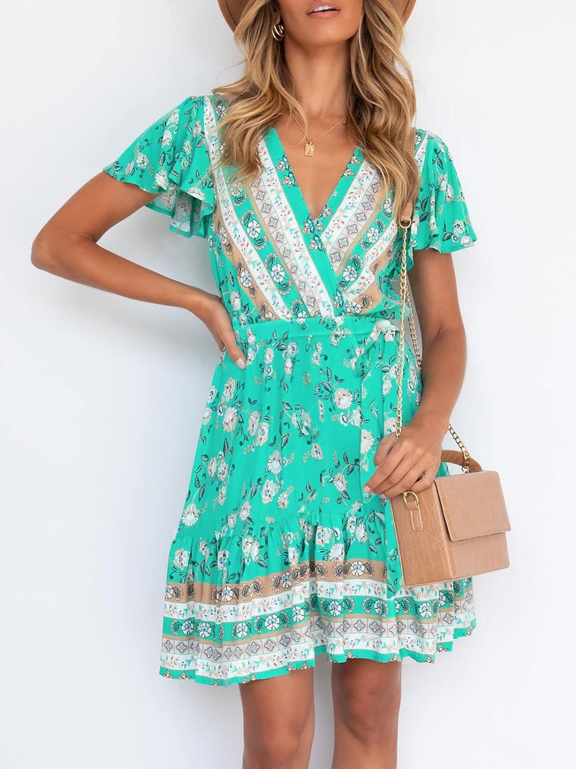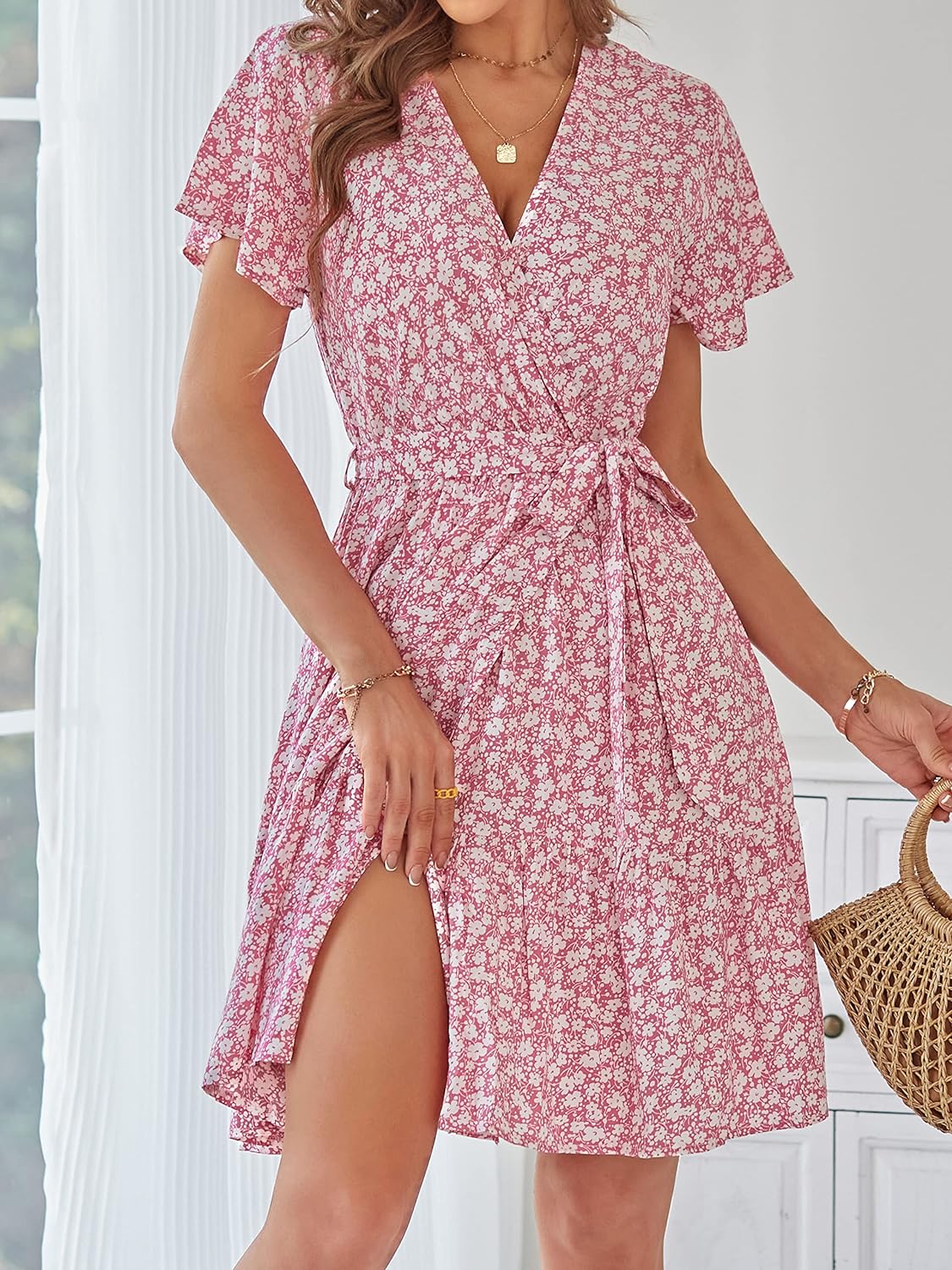 ZESICA Women’s Summer Wrap V Neck Bohemian Floral Print Ruffle Swing A Line Beach Mini Dress