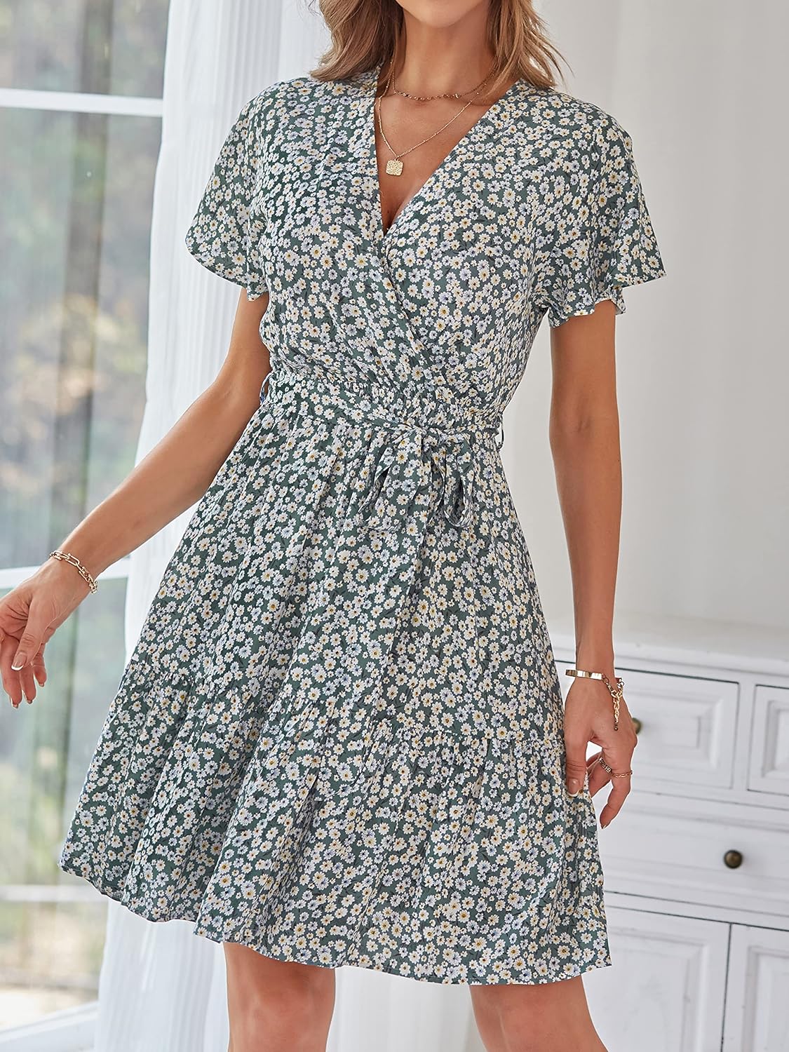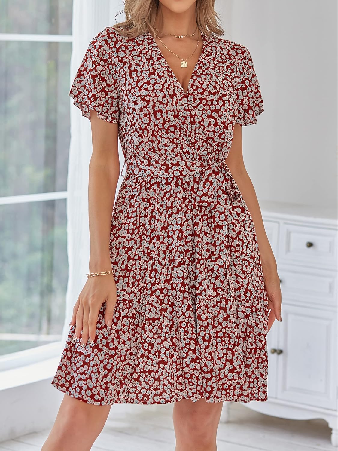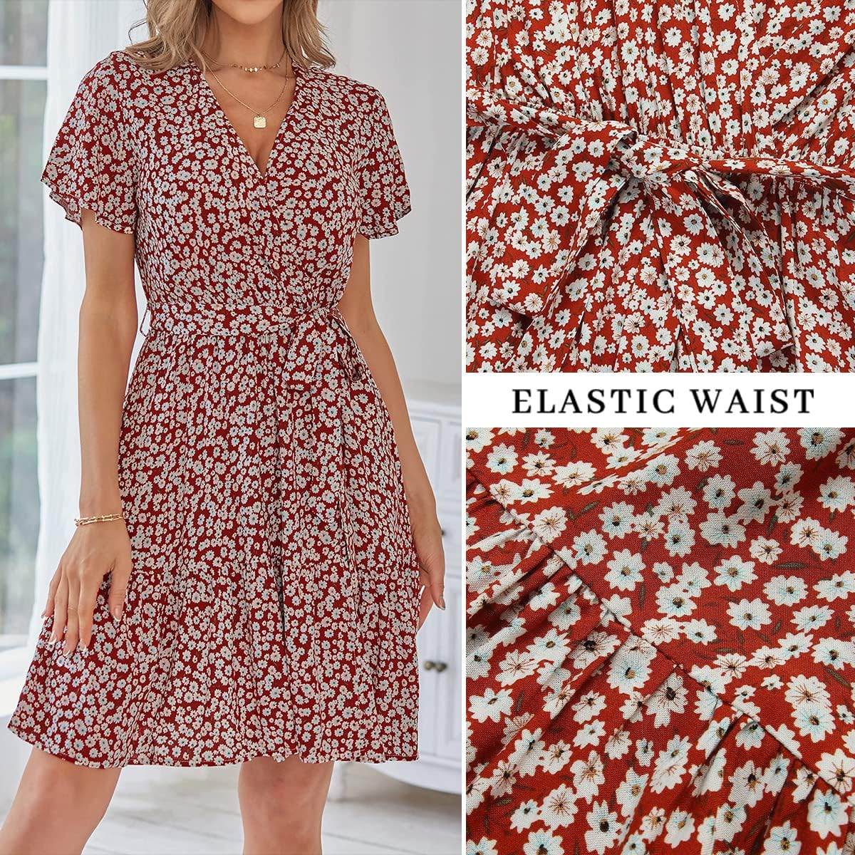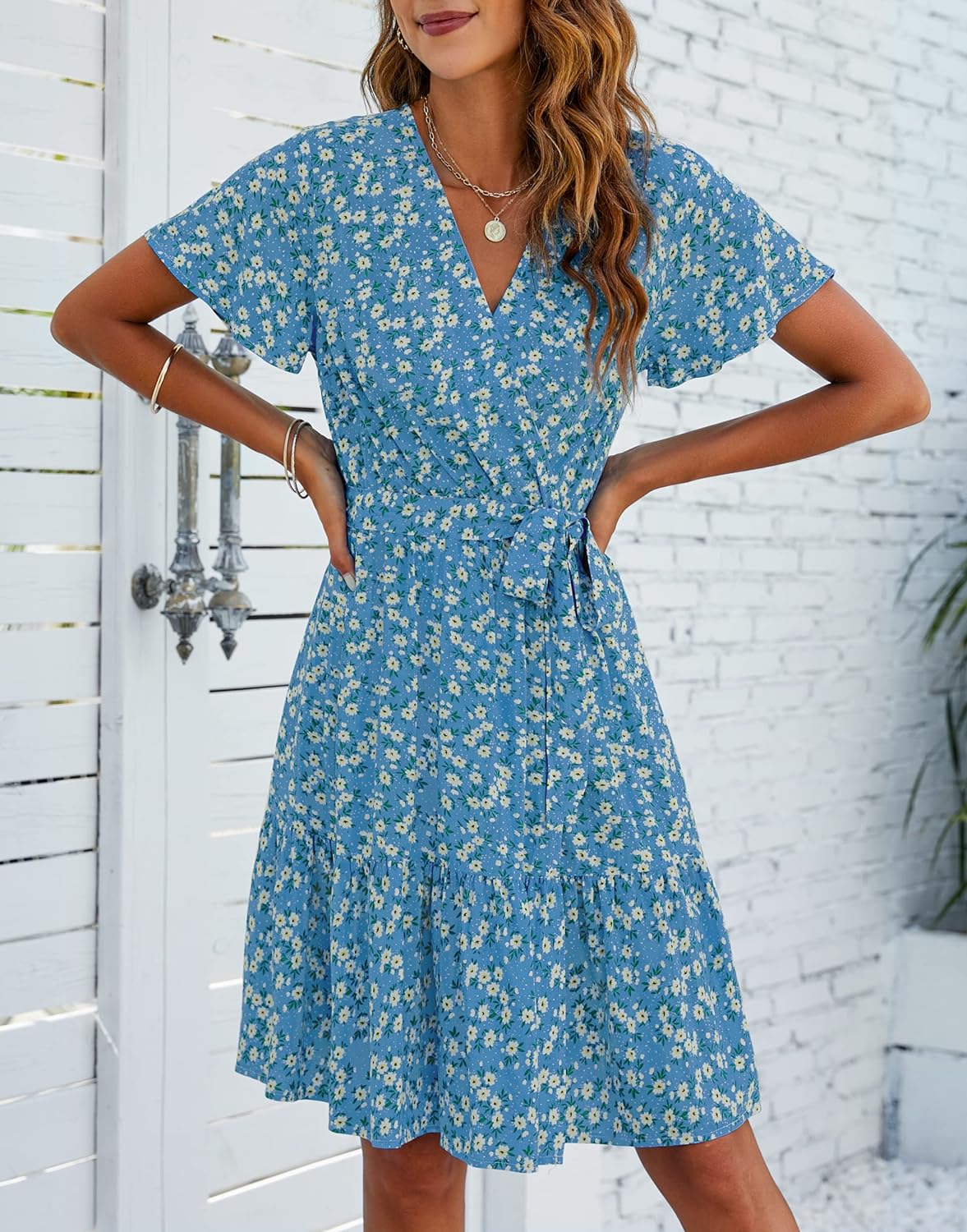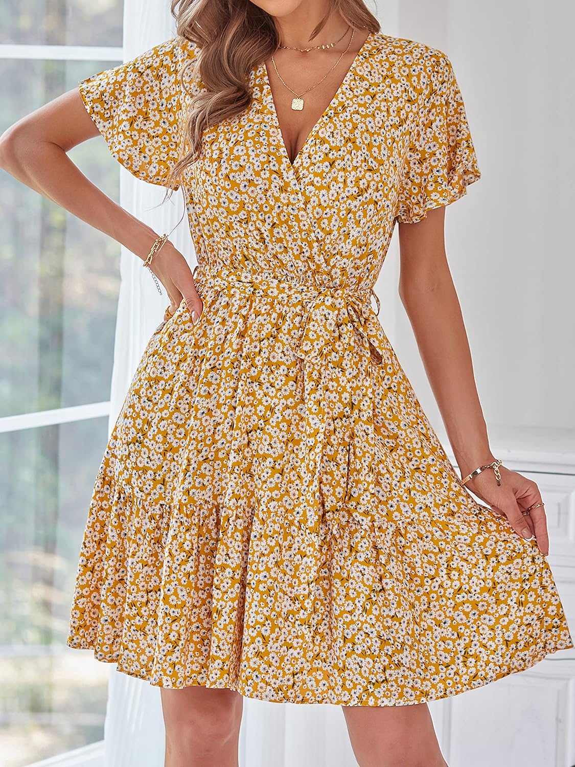 ZESICA Women’s Summer Wrap V Neck Bohemian Floral Print Ruffle Swing A Line Beach Mini Dress