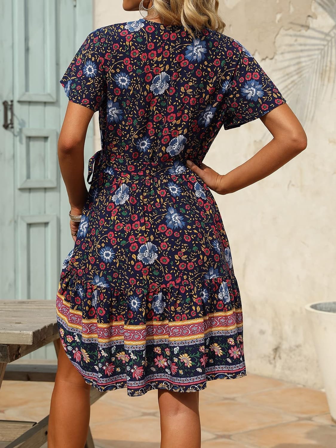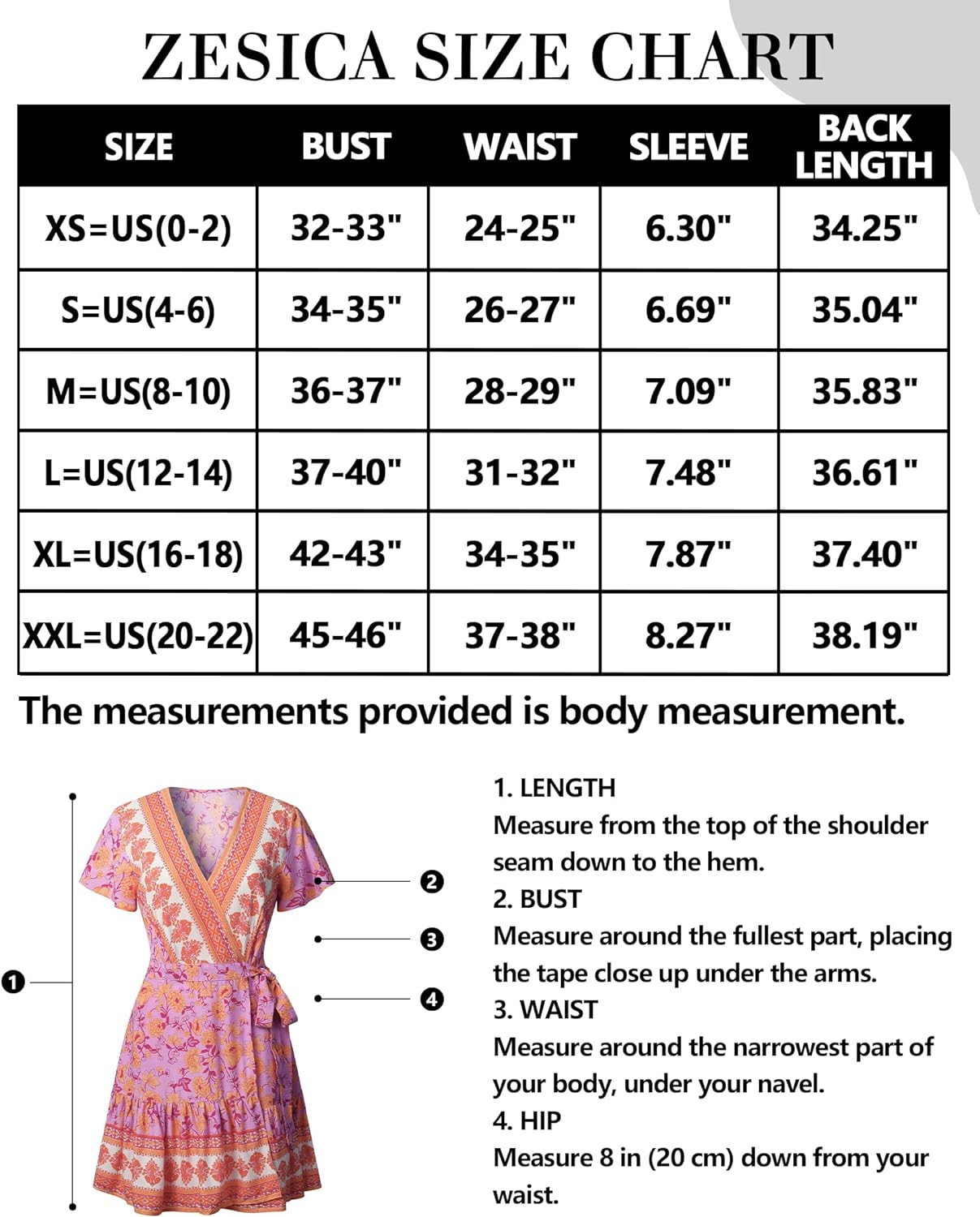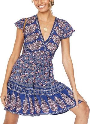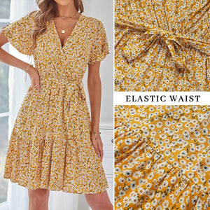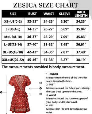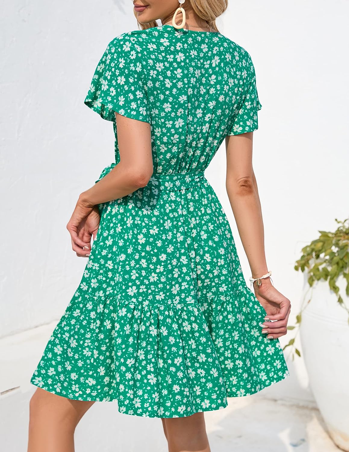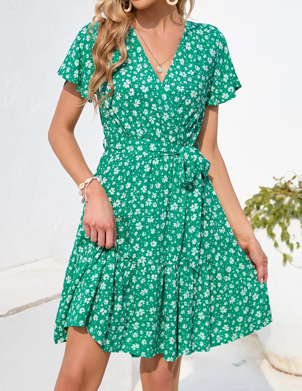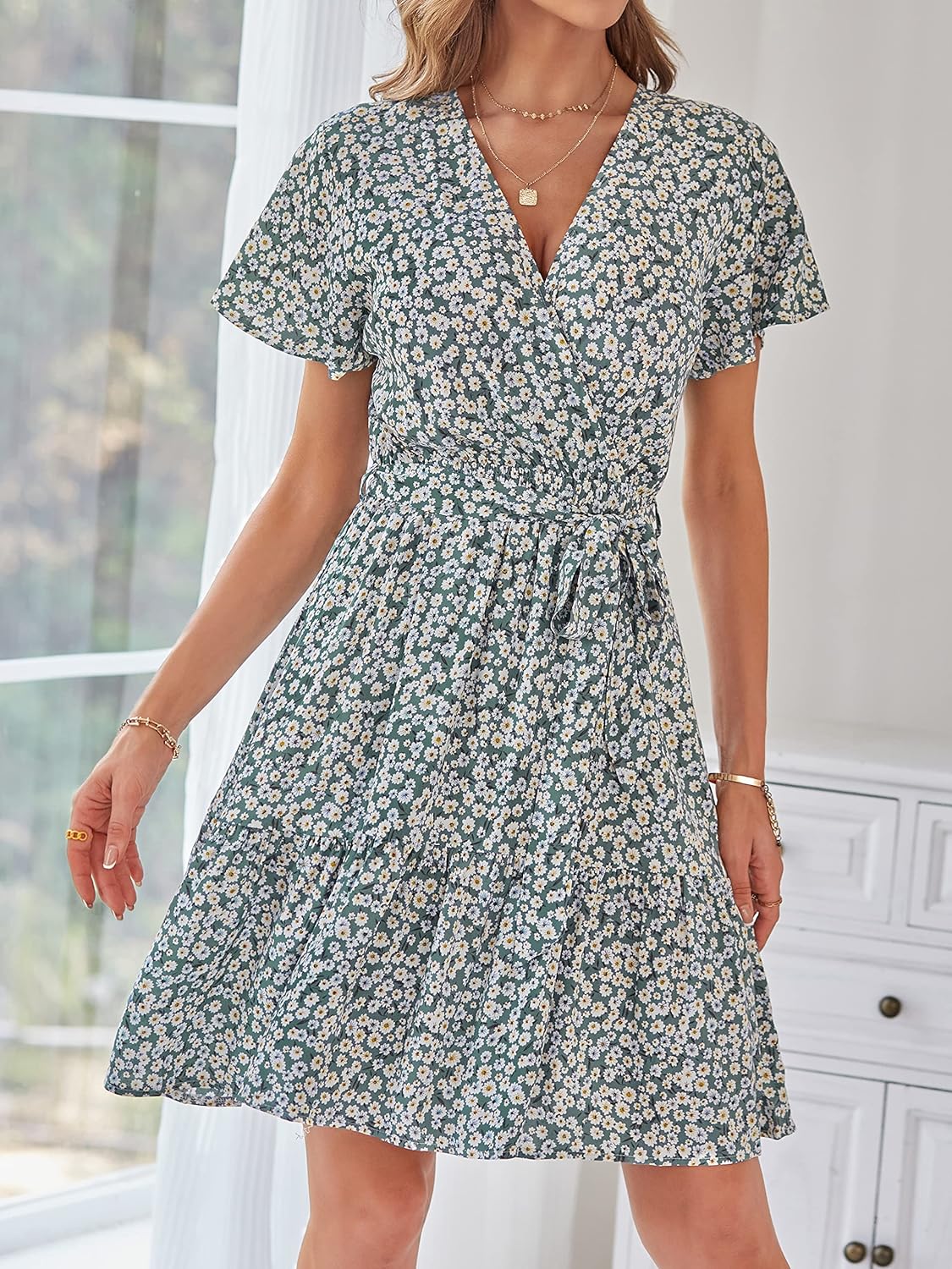 ZESICA Women’s Summer Wrap V Neck Bohemian Floral Print Ruffle Swing A Line Beach Mini Dress