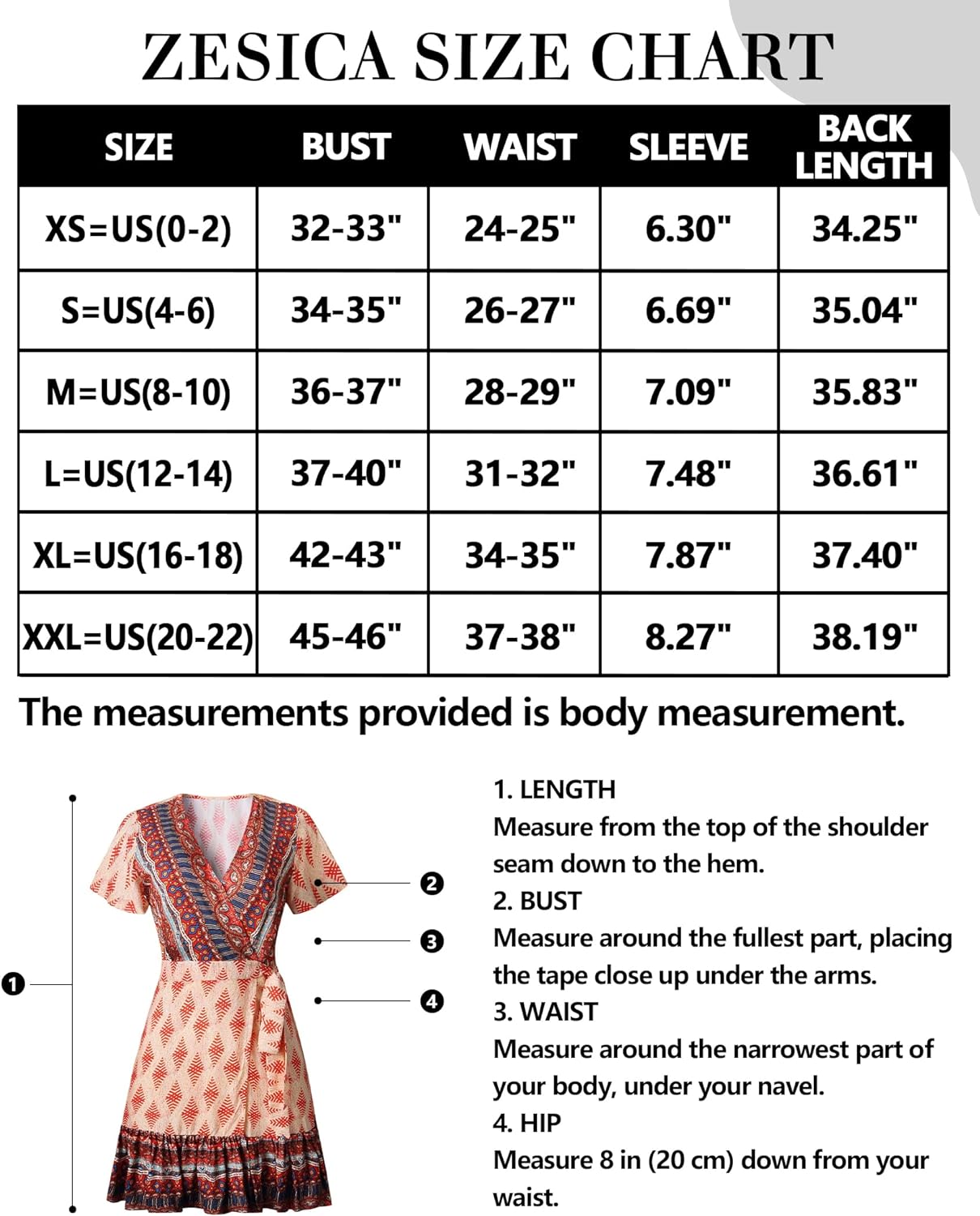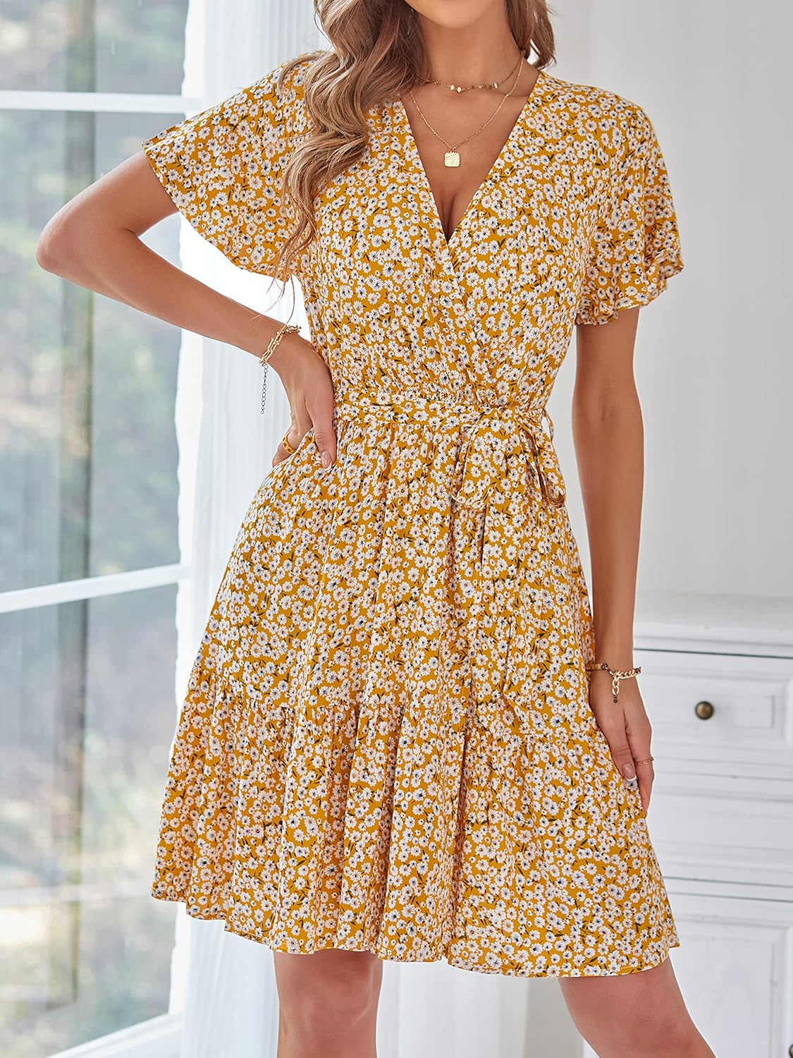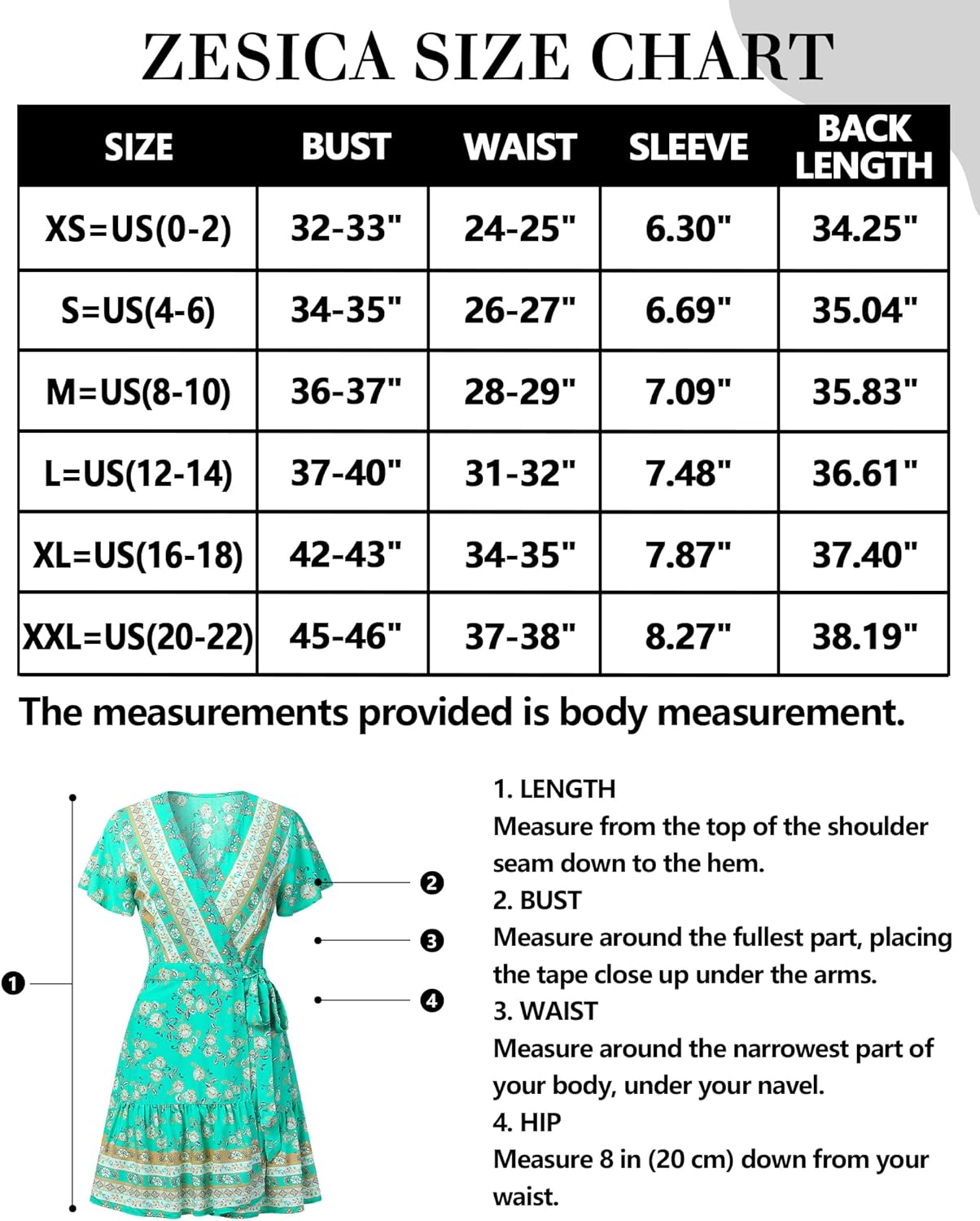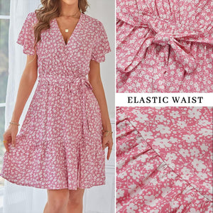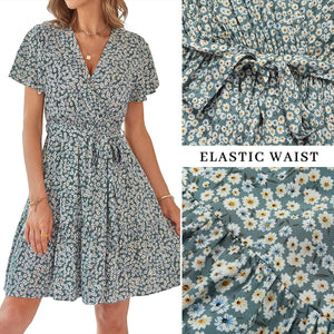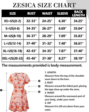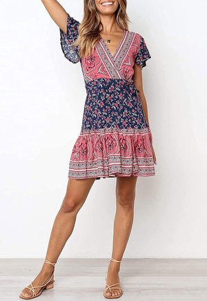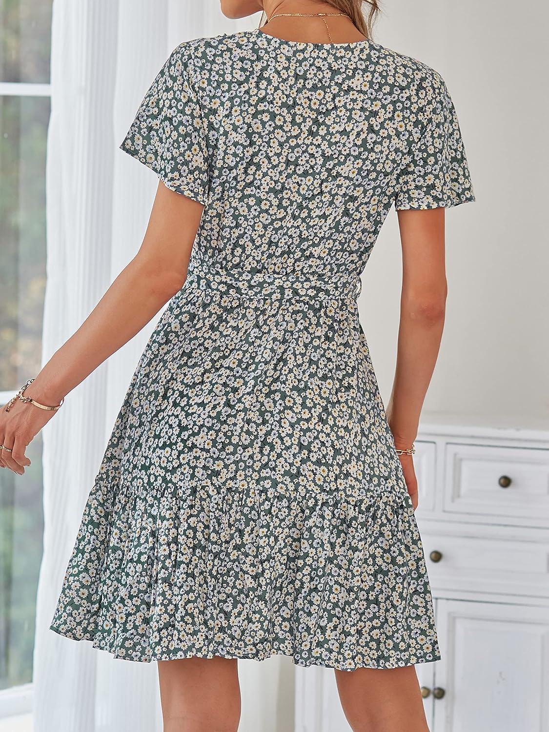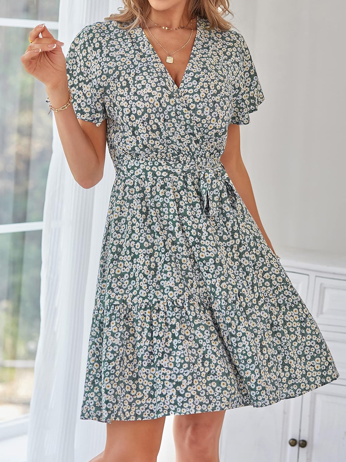 ZESICA Women’s Summer Wrap V Neck Bohemian Floral Print Ruffle Swing A Line Beach Mini Dress
