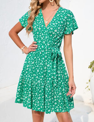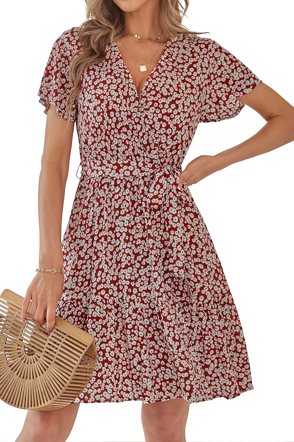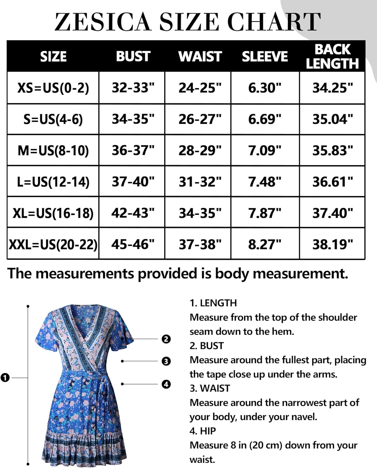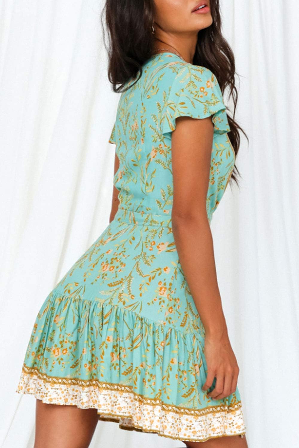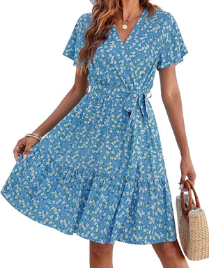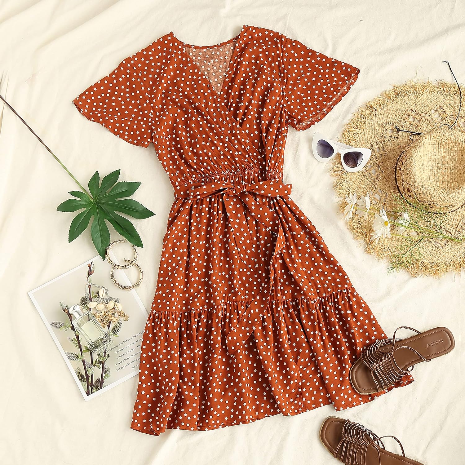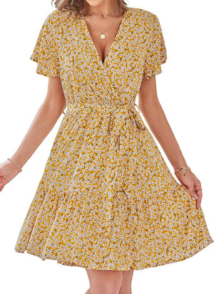 ZESICA Women’s Summer Wrap V Neck Bohemian Floral Print Ruffle Swing A Line Beach Mini Dress
