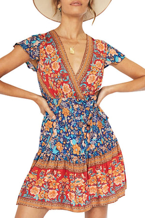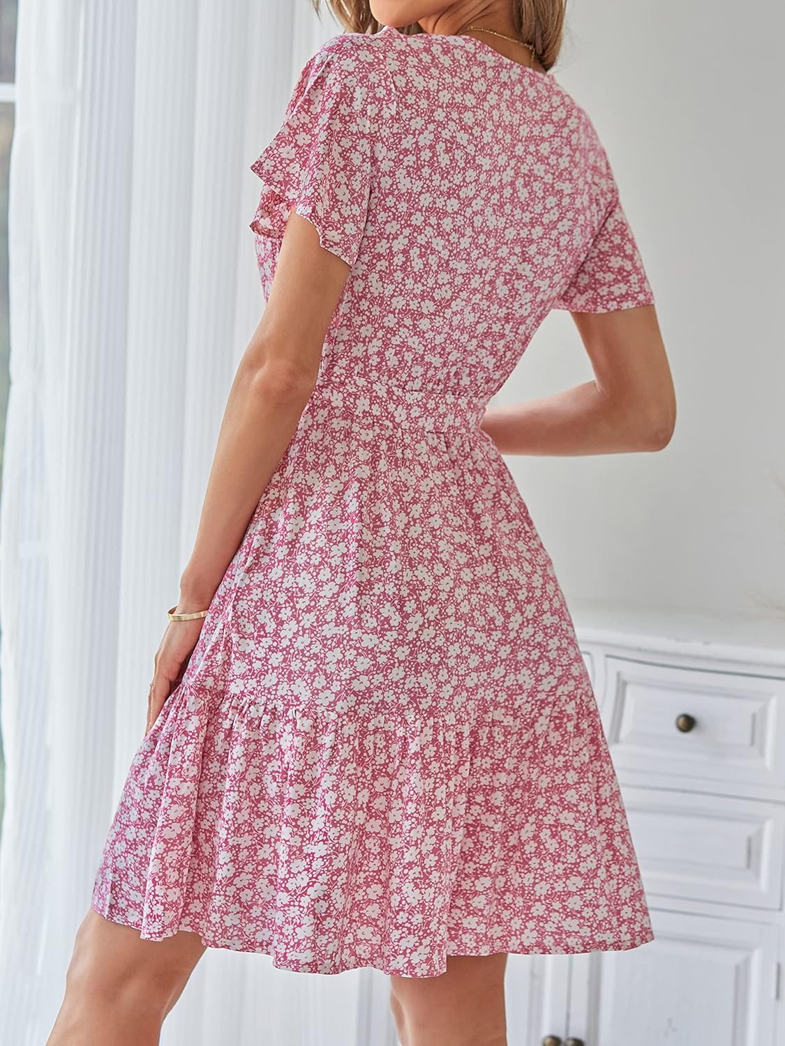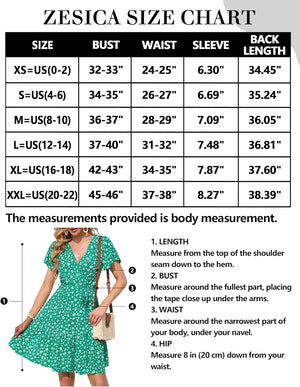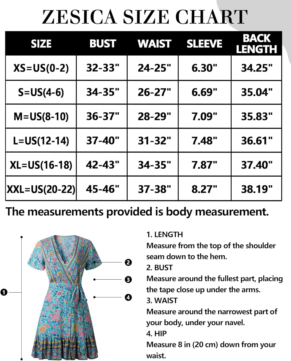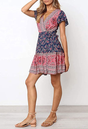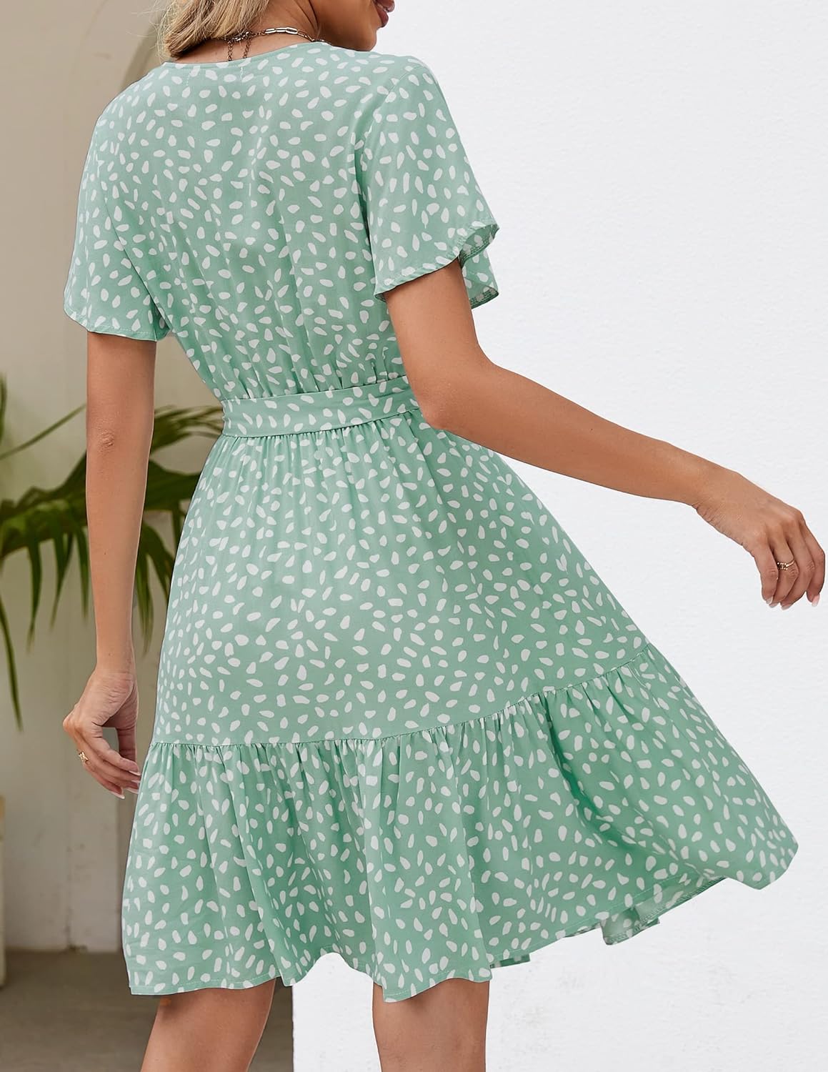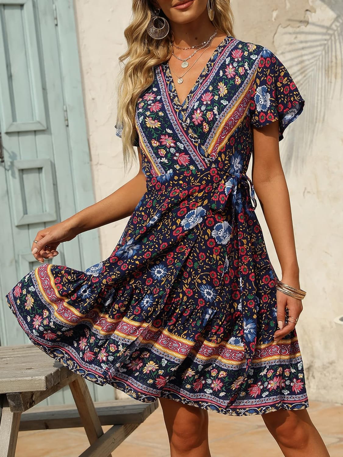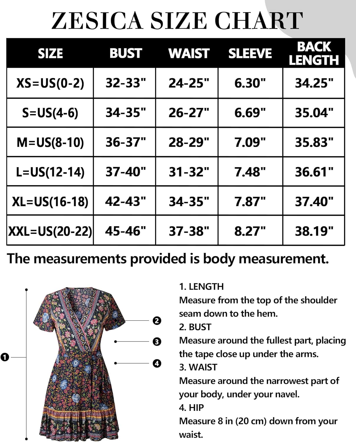 ZESICA Women’s Summer Wrap V Neck Bohemian Floral Print Ruffle Swing A Line Beach Mini Dress