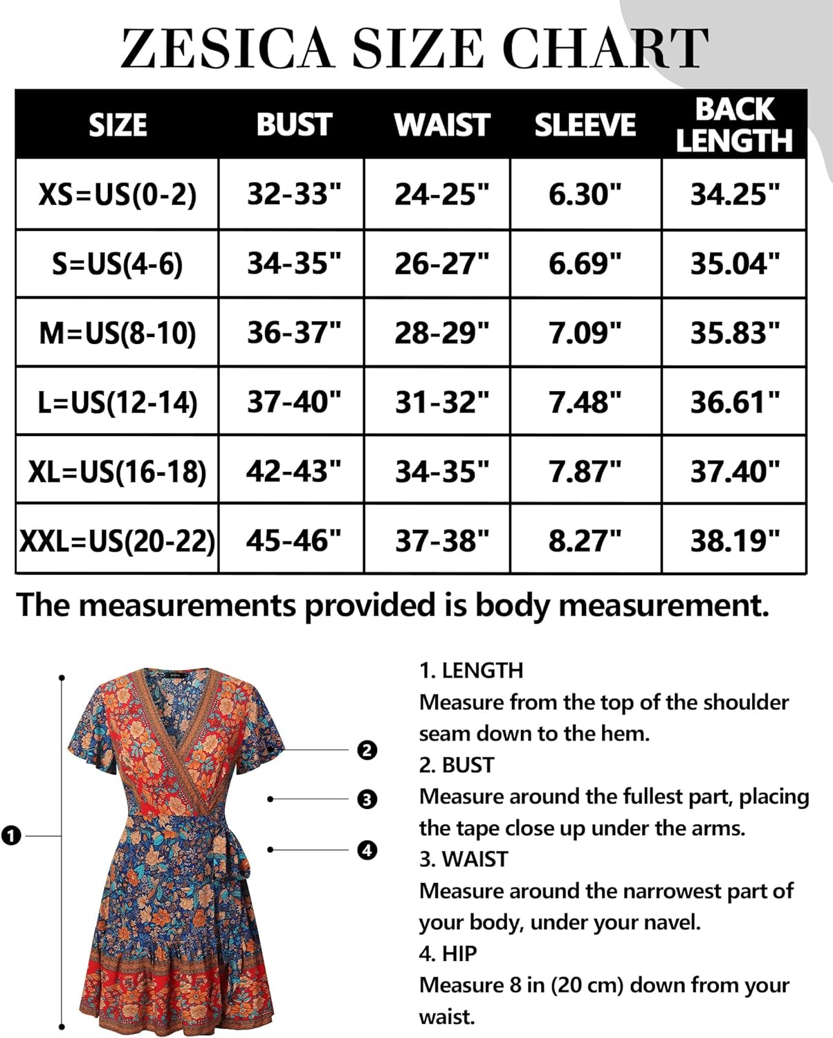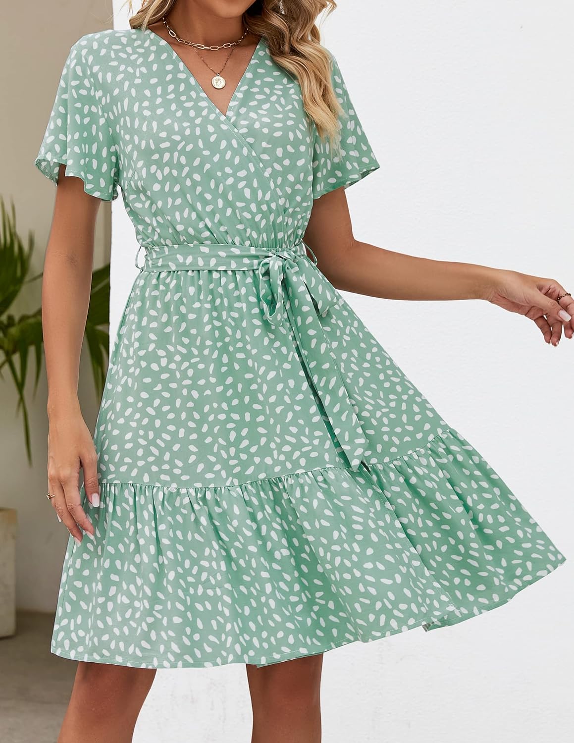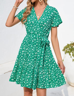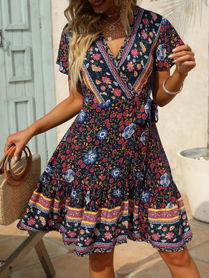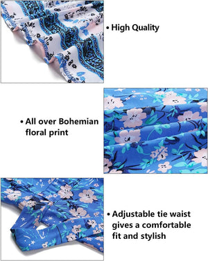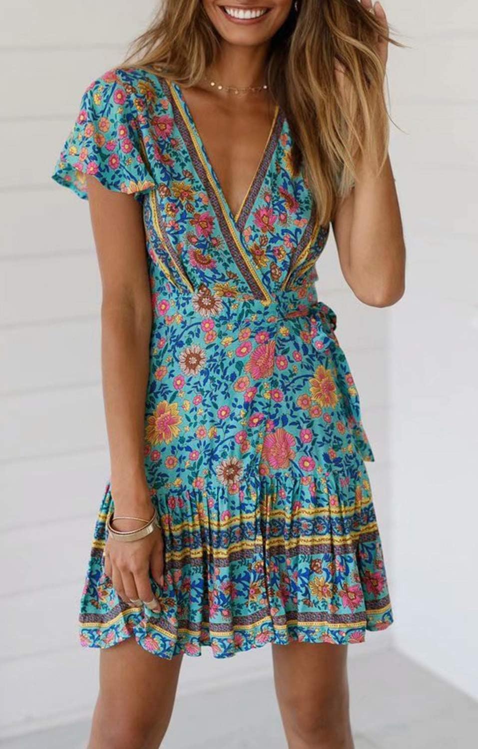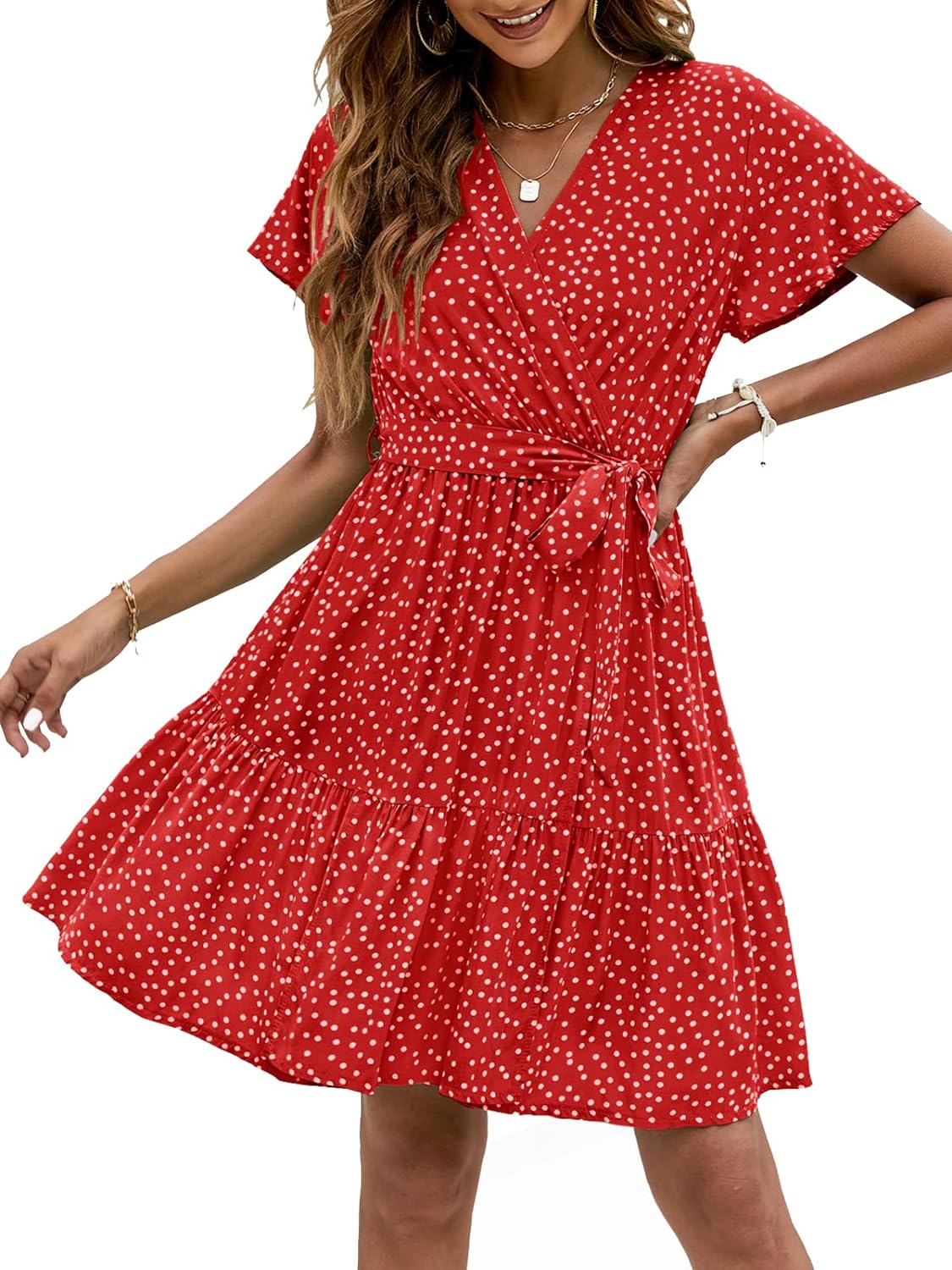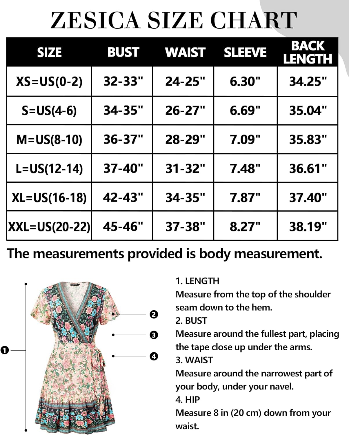 ZESICA Women’s Summer Wrap V Neck Bohemian Floral Print Ruffle Swing A Line Beach Mini Dress