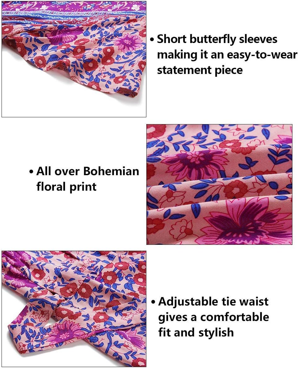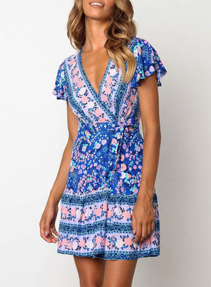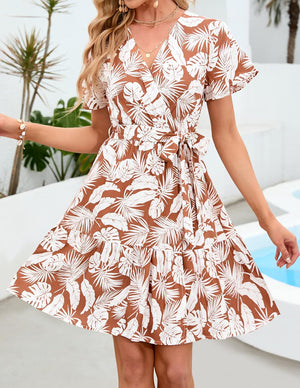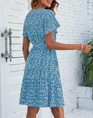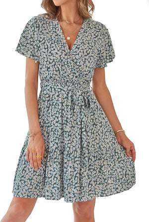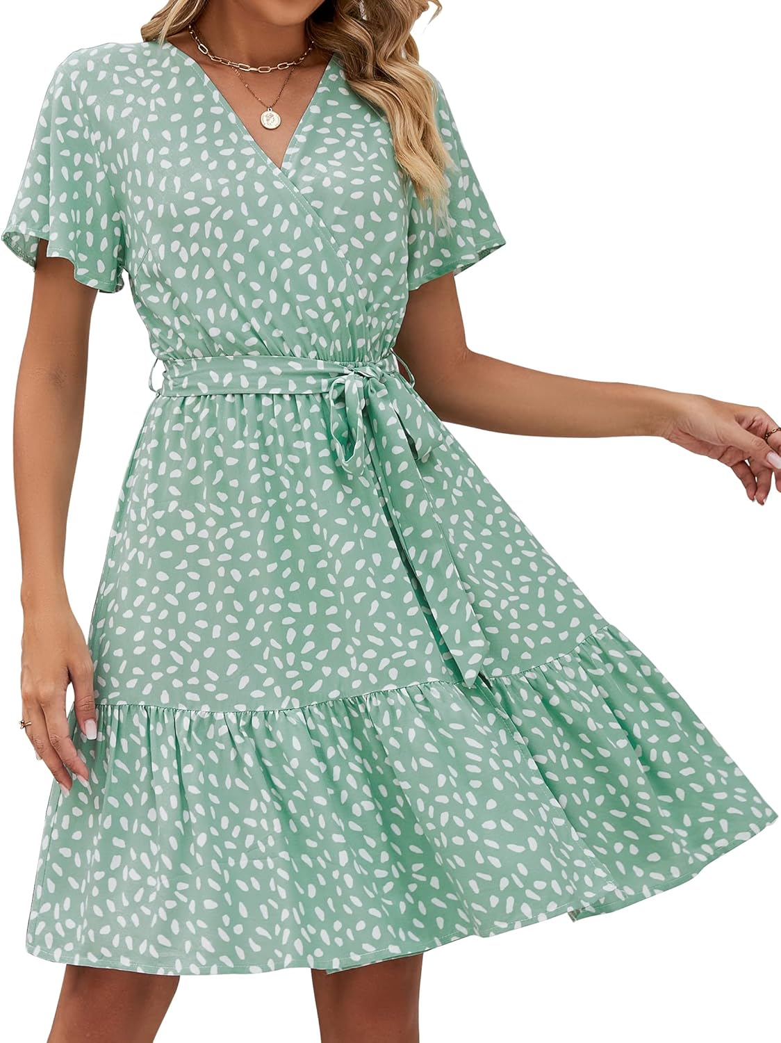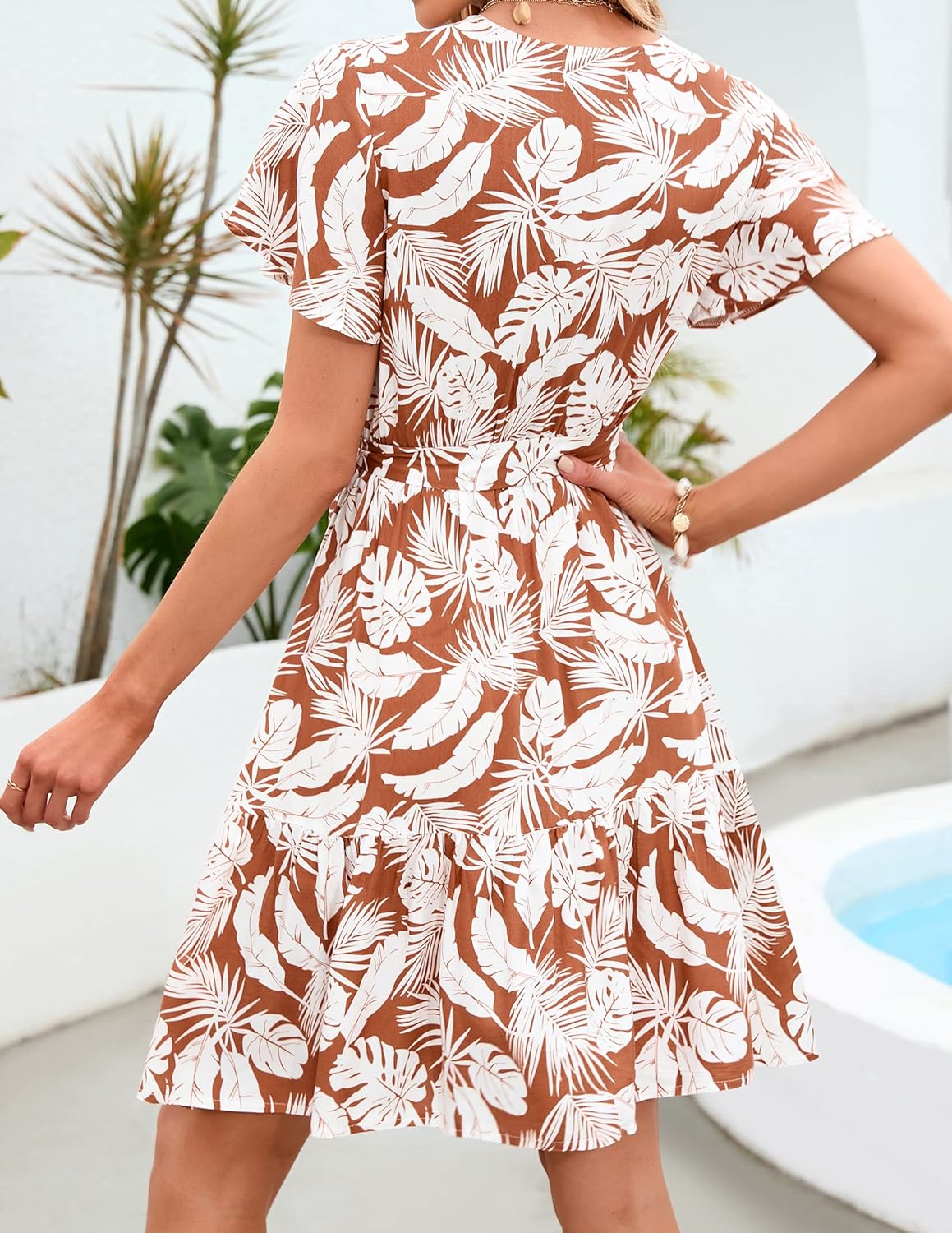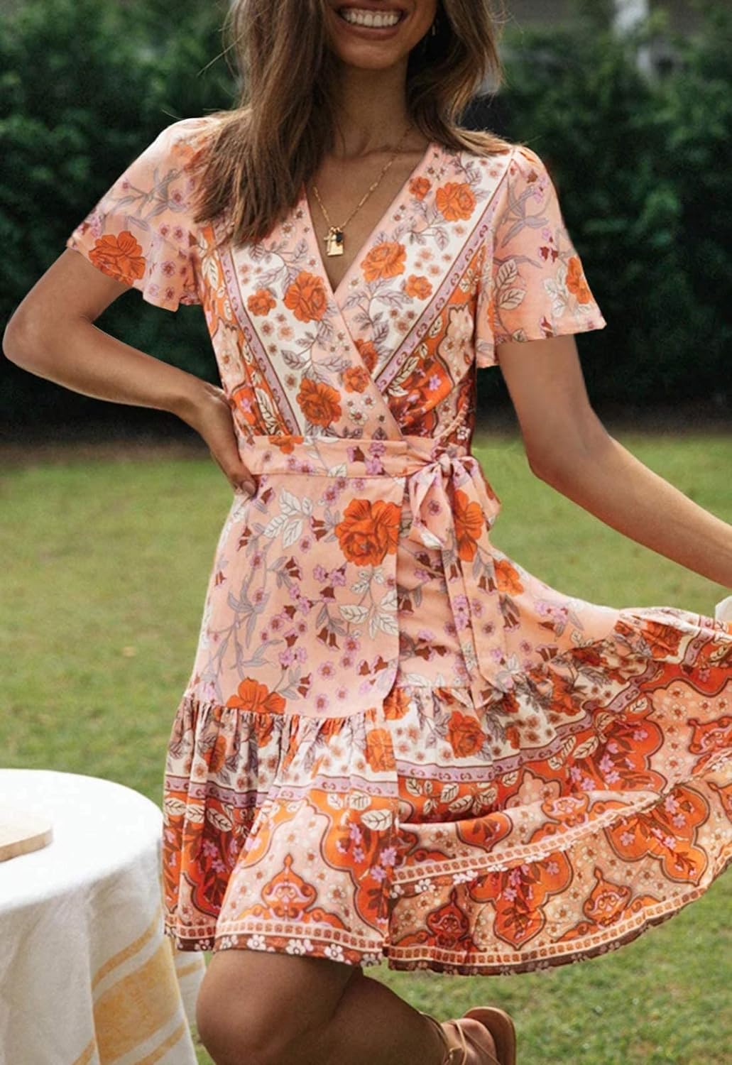 ZESICA Women’s Summer Wrap V Neck Bohemian Floral Print Ruffle Swing A Line Beach Mini Dress