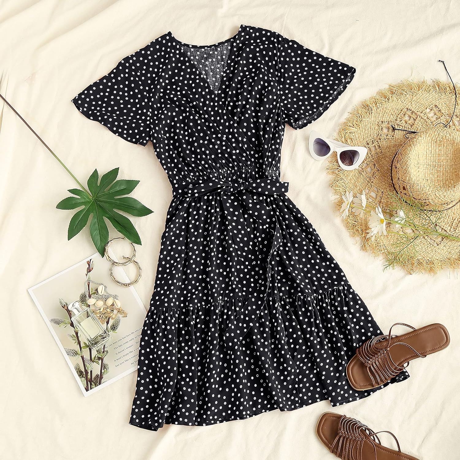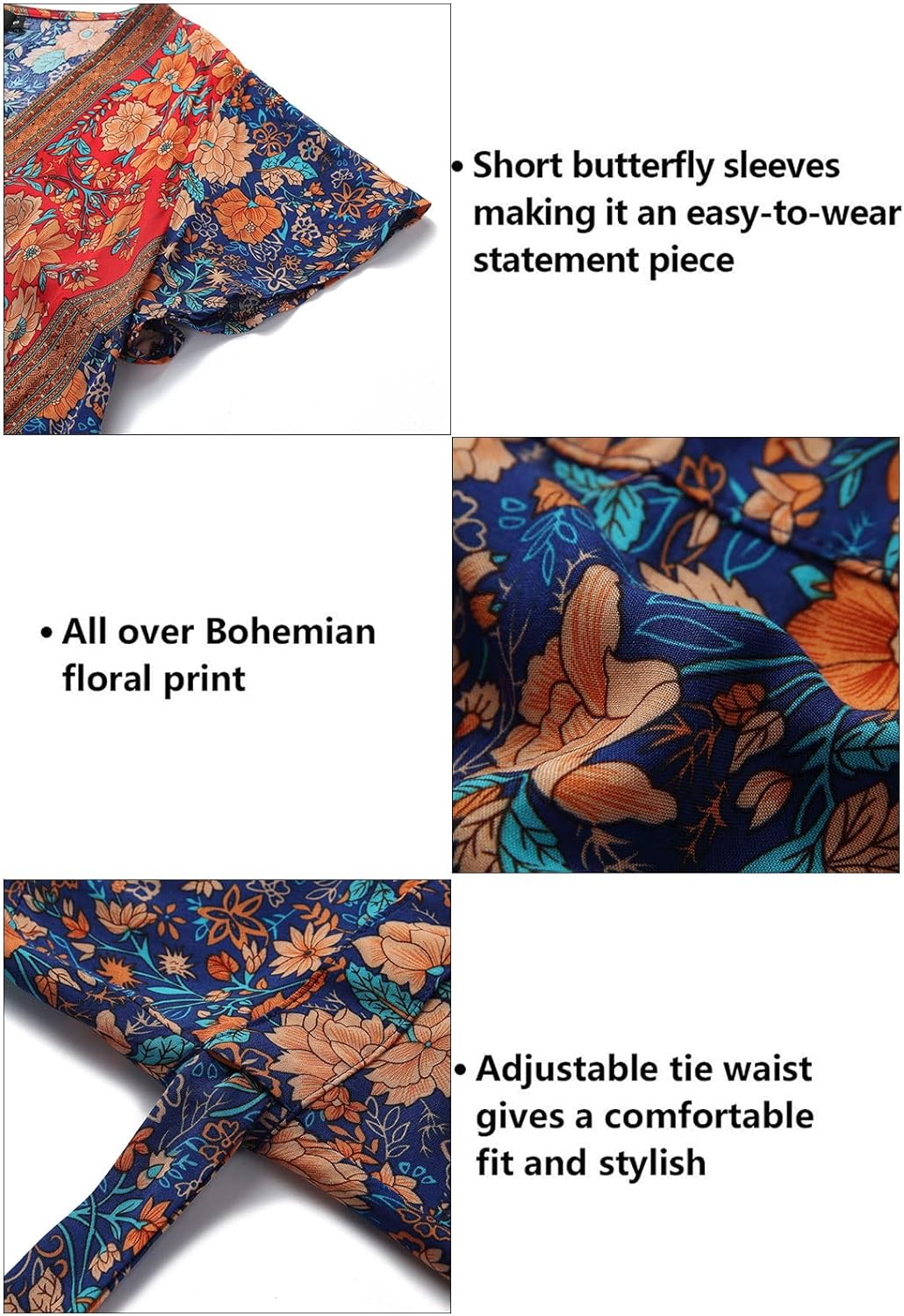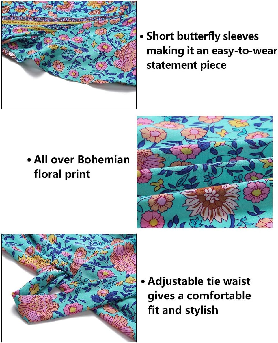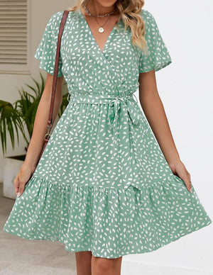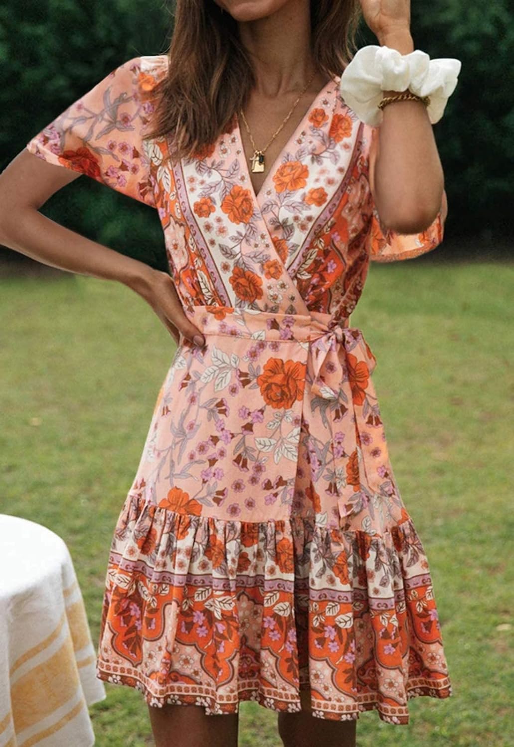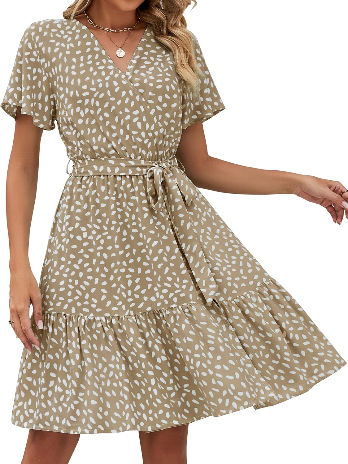 ZESICA Women’s Summer Wrap V Neck Bohemian Floral Print Ruffle Swing A Line Beach Mini Dress