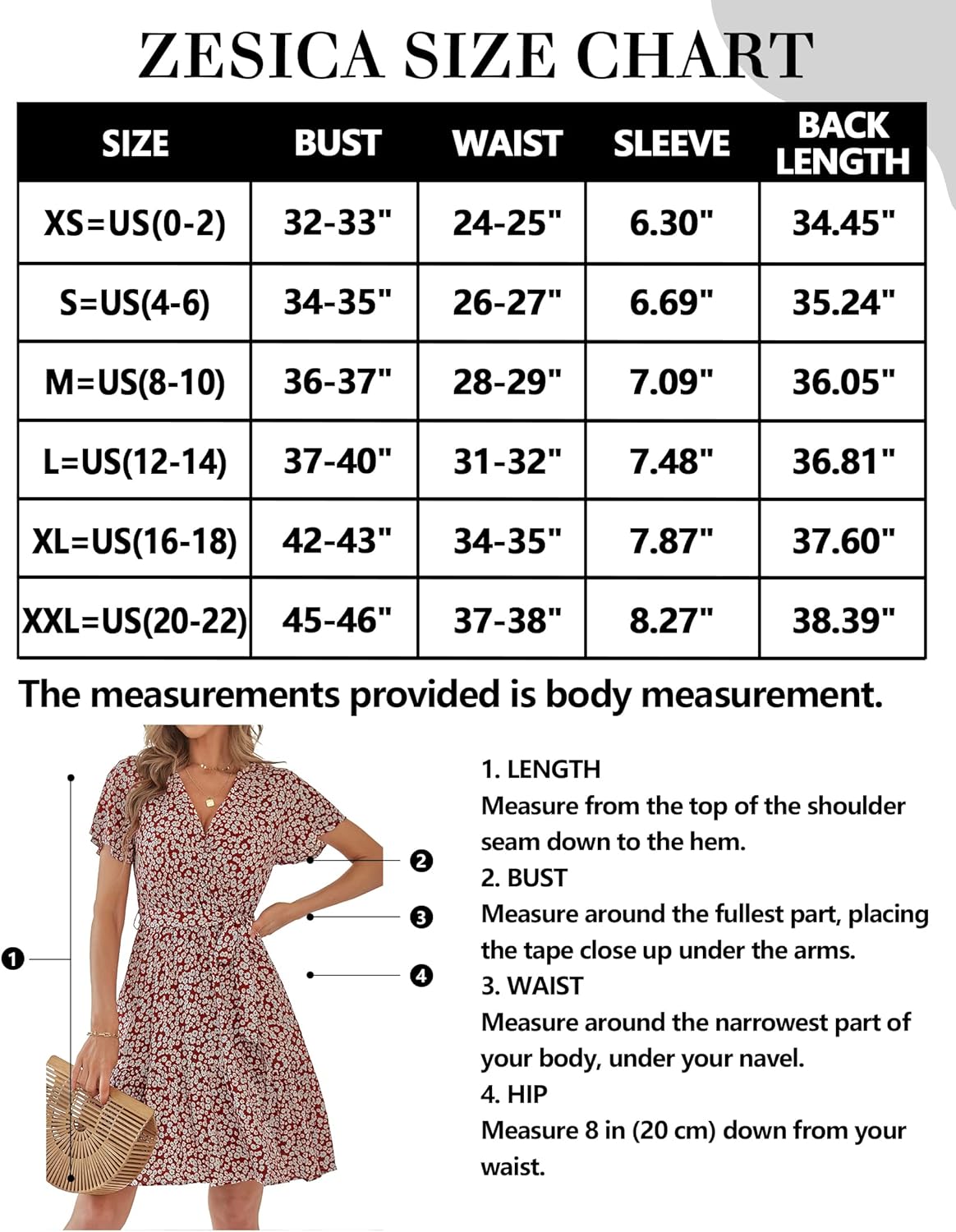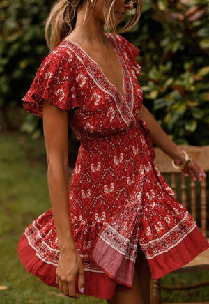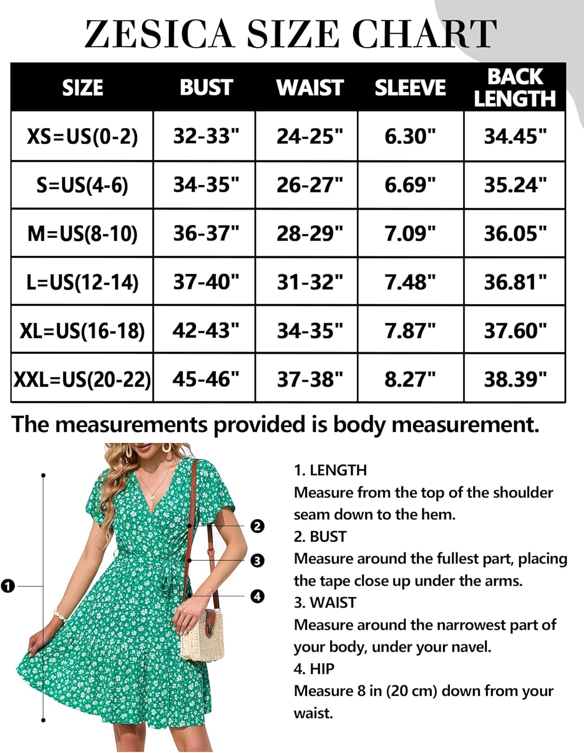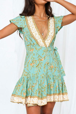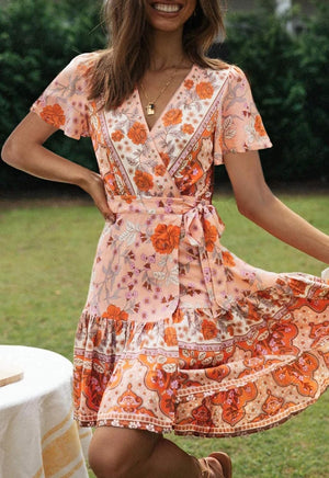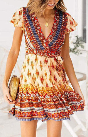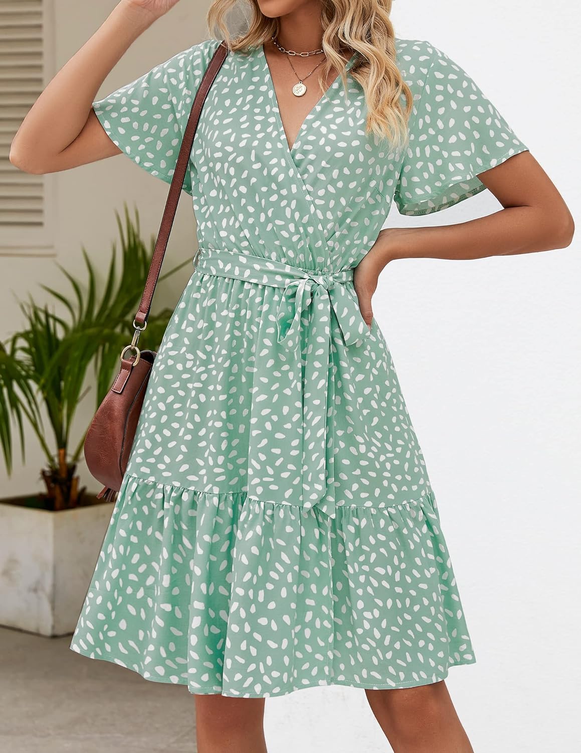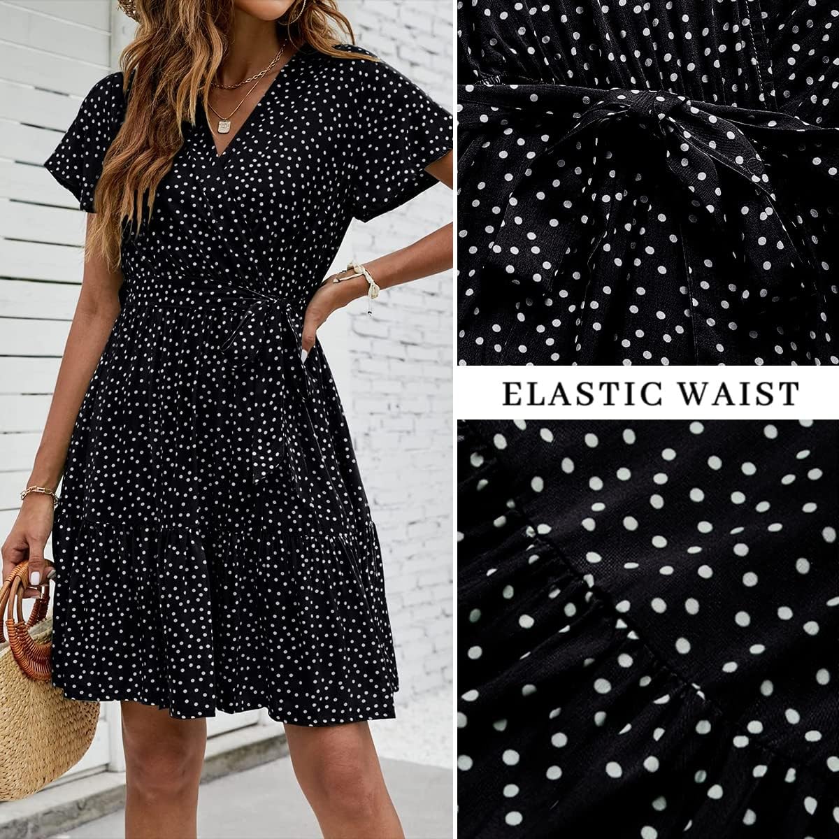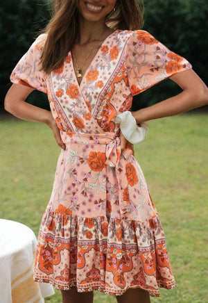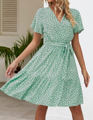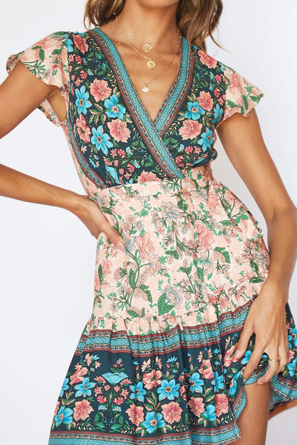 ZESICA Women’s Summer Wrap V Neck Bohemian Floral Print Ruffle Swing A Line Beach Mini Dress