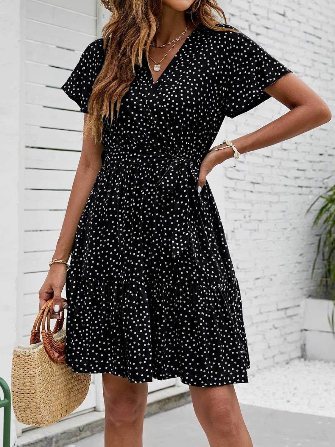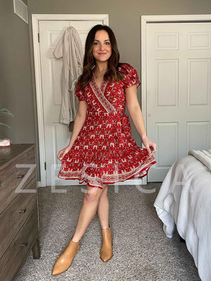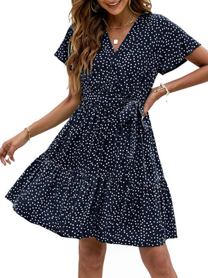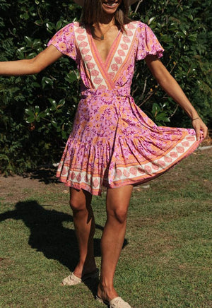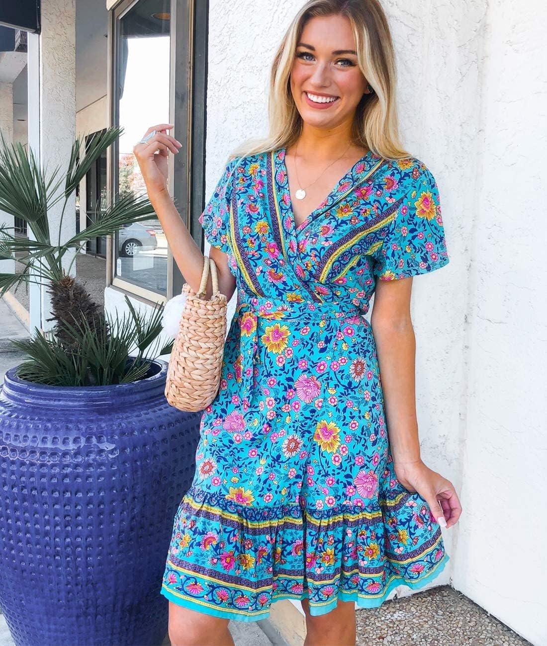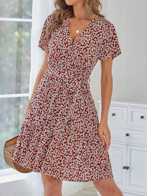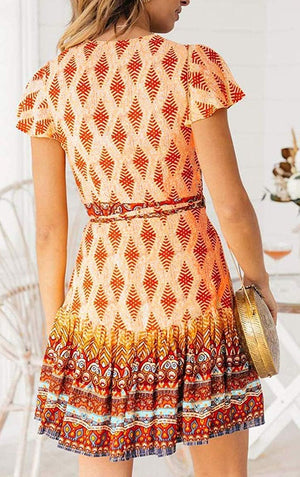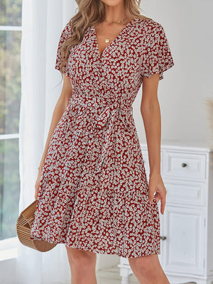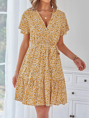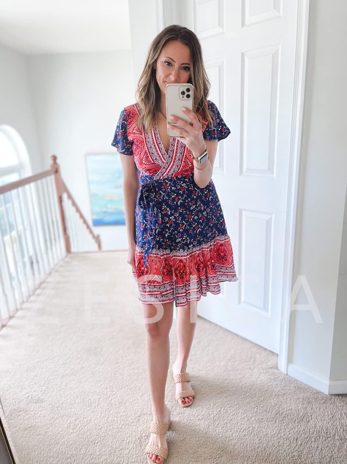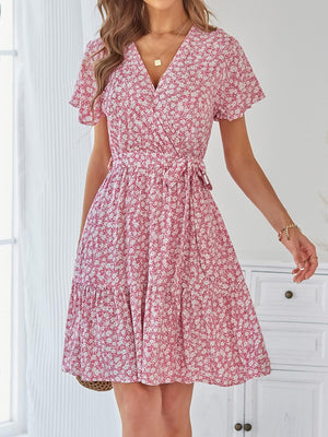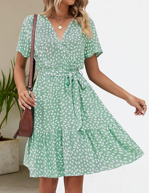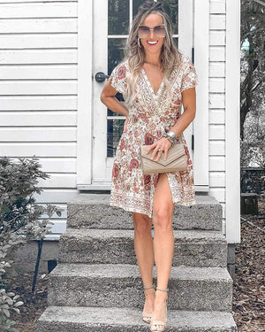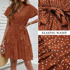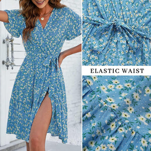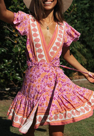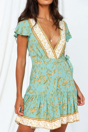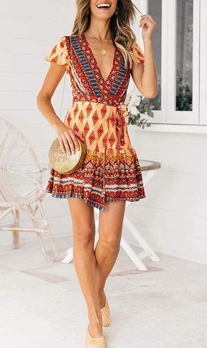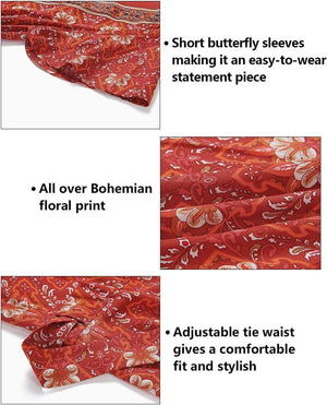 ZESICA Women’s Summer Wrap V Neck Bohemian Floral Print Ruffle Swing A Line Beach Mini Dress
